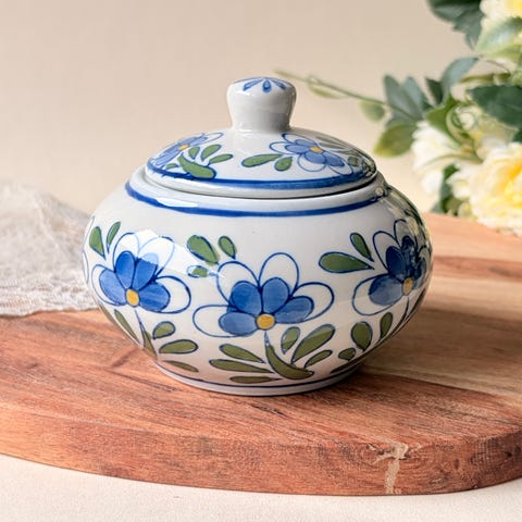 søkeord: praktisk sjarmerende syltetøyskrukke krukke kjøkkenutstyr dekorasjon pynt kjøkken krukke keramikk hvit hvitt pyntekrukke sukker blomster blomsterdekor blomsterdekorasjon dekor pyntegjenstand styling interiør krukke trend retro dekorativ borddekorasjon bordpynt glans oppbevaringskrukke servise oppbevaring porselen porselenskrukke keramikkkrukke porselenkrukke tekrukke kaffekrukke kjekskrukke sukkerkrukke kopp blå blått