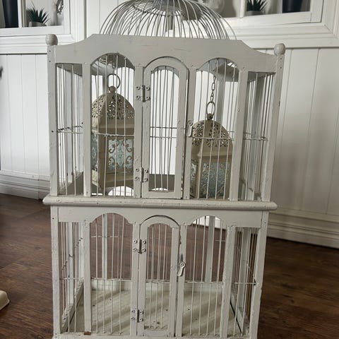 Dekorativt og sjeldent fuglebur fra Frankrike, trolig fra midten av 1900-tallet. Buret er laget i metall, malt i hvitt, og har flotte detaljer som blomster- og rankemønster i wiren. Det har en buet topp, original trepinne, samt uttakbar bunn i metall.