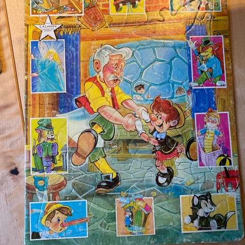 Koselig gammelt puslespill fra den norske produsenten L.A. Larsen i Flekkefjord. Motiv fra eventyret om Pinocchio og Gepetto, omgitt av små scener og figurer fra fortellingen.