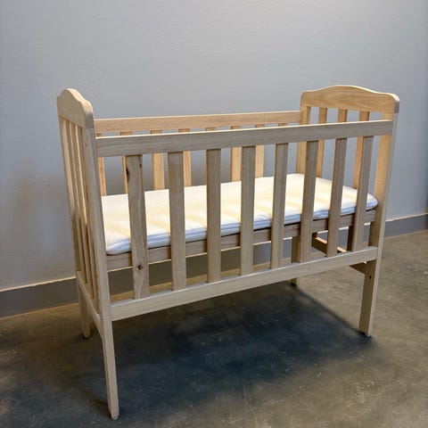 Sprinkelseng i furu og giftfri maling. Sengebunnen kan justeres i tre ulike høyder.