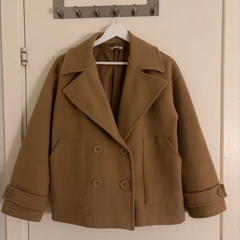Munthe ytterjakke i brun farge, størrelse 38 for kvinner. Jakken har dobbelspent knappelukking, bred krage og mansjetter på ermene. Materialet gir et mykt og varmt uttrykk, egnet for utendørs bruk.
