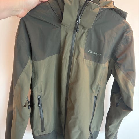 Jeg bruker til vanlig str S/M og denne passer fint. Mulighet for innstramming ved hoftene og på hetten. Lufting under armene. To brystlommer og en innerlomme. Nesten ingen bruksmerker; et nede til hø bak på jakken, se bilde.