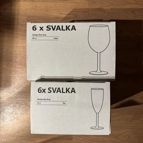 Har 41 IKEA SVALKA vinglass (6 esker med 6 glass, og en med 5) Glassene er laget av klart glass og har en klassisk design med stilk. Egnet for selskap.