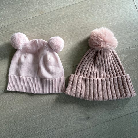 Søte NoaNoa luer i str 68 og 86 brukt til to søstre. Den minste er i gammelrosa med blomstermønster. Den største i flott brun/rosa farge. Selges samlet