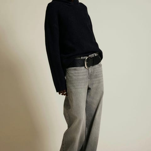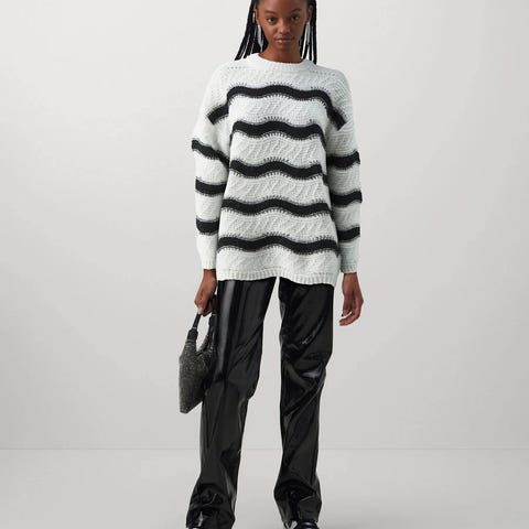 COS høyhalset genser i beige farge, størrelse XS for damer. Genseren har en høy hals og stripemønster i hvitt. Materialet er mykt og egnet for kaldere vær. 64% ull og 36% bomull. Oversized