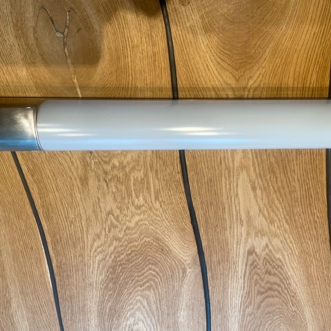 Lampa er signert B.S noe jeg tror er Brødrene Sæther.Firmaet spesialiserte seg på elektrisk armatur og belysningsutstyr. Blant annet produserte de "notox"-behandlet messing utstyr.(Kopiert tekst fra Industrimuseum)Lampa ser kanskje enkel ut med her er det solid arbeid og endel er utført for hånd.På bildet er hele lengden 116 cm Diameter 14 14 cm .Lampa er pen. Lyser godt i retning ned og har en fin ekstra effekt via perforeringen i kobberet.