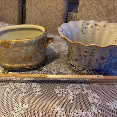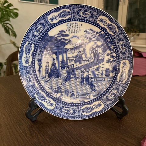 Keramisk vase med blått fuglemotiv og blomsterdekor. Vasens overflate har en lett krakelert tekstur og bølget kant øverst. Målene er omtrent 30 cm i høyden. Vasen har en rektangulær form med dekorative detaljer på alle sider.