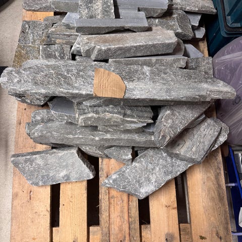 Håndstein, grå, levert av Sollesnes Stein. Ca 70 kvadrat. Steinen ligg laust då paller er gått i oppløysing. Hbo 70 000 ved stabling/lasting i henger sjølv, dersom ein ynskjer det stabla på paller blir det eit pristillegg.