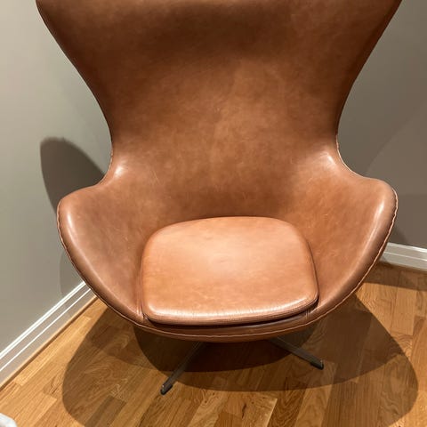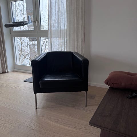Italiensk designet lenestol i fullpolstret sort skinn helt uten riper, bra sittekomfort. Førpris 3.900.