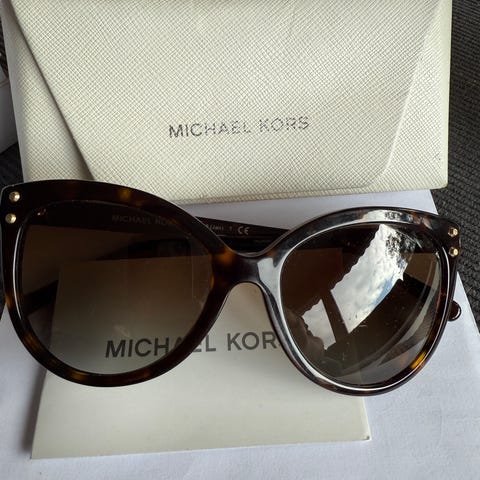 Michael Kors solbriller for dame med brunt mønstret innfatning og brune glass. Solbrillene har en klassisk design og kommer med etui og rengjøringsklut. Mål bredde fra stang til stang 14.0cm.