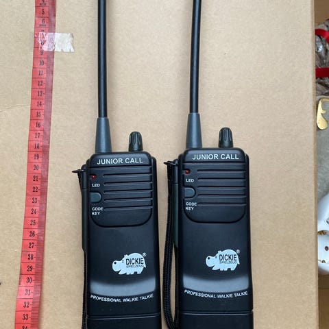 To rosa walkie-talkies selges for 100kr. Er fra binatone og har ingen synlige bruks merker. Står at det er opp til 3 km rekkevidde, men vi har ikke testet det ut. Latitude er 150. Er en engelsk plugg, men det er enkelt å få tak i en adapter til norsk. Her er en link til bruksanvisning: https://www.exteradirect.co.uk/download/product/002105/Binatone_Latitude150.pdf