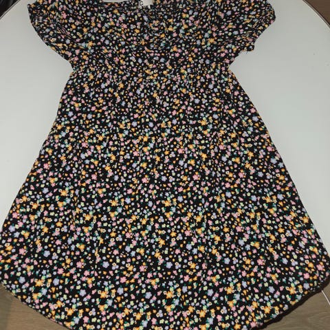 Cubus kjole i størrelse 140 for jenter. Kjolen er hvit med et blomstermønster i lilla og grønne toner. Den har korte ermer med puffdetaljer og en løs passform med et belte i midjen. Materialet fremstår som lett og egnet for barn.