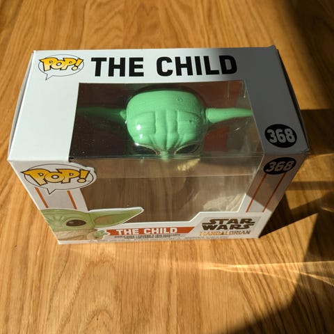 Star Wars The Mandalorian The Child er en figur med grønn hud, store ører, og iført en brun kappe. Figuren holder et blått og gult leketøy. Passer til samling eller dekorasjon.