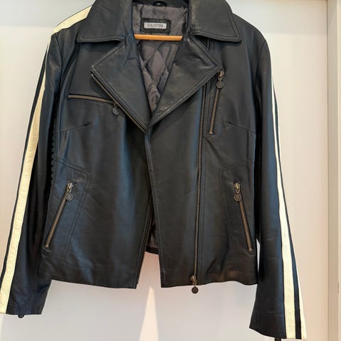 Svart Skinnjakke med gullknapper fra Cortefiel, kjøpt i Spania. Kjøpt for kr 2000, selges for 1300. Størrelse 38.
