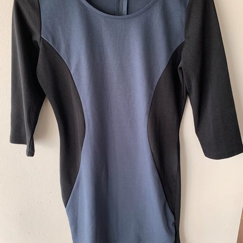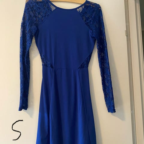 Bubbleroom (Chiara Forthi) festkjole i blå farge, størrelse S. Kjolen har lange ermer og en dekorativ mesh-detalj ved utringningen. Egnet til formelle anledninger og festbruk.