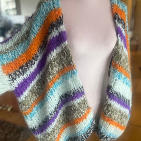 Jeg selger en helt ny cardigan jeg selv har strikket i luksuriøst Kid Mohair-garn.