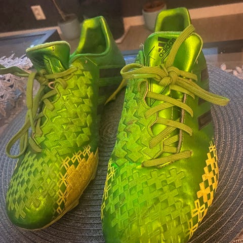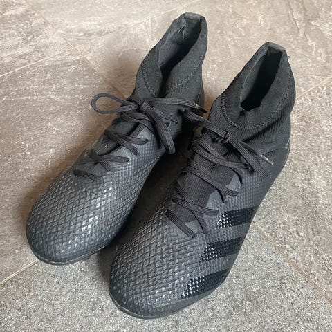 Adidas Predator fotballsko i størrelse 42. Fargen er svart med gule detaljer. Skoene har knotter for bruk på gressbaner. Materialet er syntetisk. Passer for voksne.