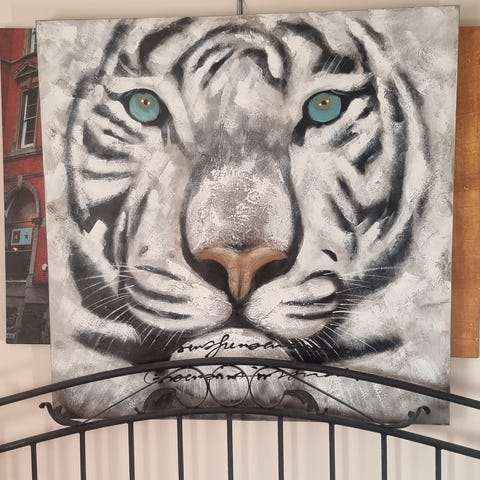 Tiger maleri med motiv av en tiger i svart, hvit og blå farger. Maleriet måler cirka 43x54 cm. Lerretet viser noe slitasje og skader på kantene. Signatur er synlig på forsiden av maleriet.
