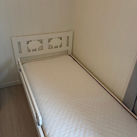 barneseng med madrass. IKEA seng med hvit madrass. Sengen har en enkel design med dekorative utskjæringer på hodegavlen. Madrassen er hvit og tilpasset sengerammen. Passer til enkeltrom eller barnerom. Extra 2 laken jente farge og tisse laken