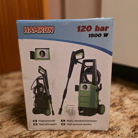 Hamrom høytrykkspyler. Utstyrt med lang slange og beholder for rengjøringsmiddel. Farge: grønn. Egnet for rengjøring av uteområder, kjøretøy og lignende.