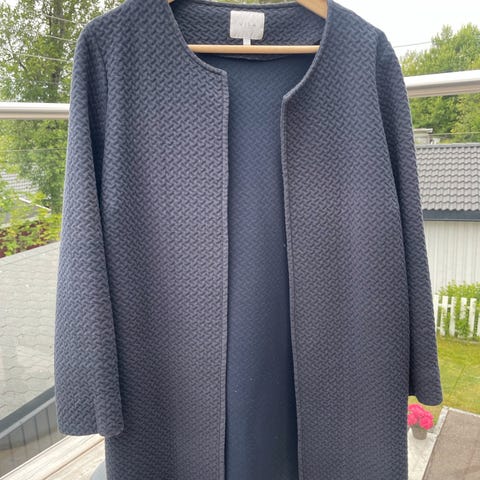 Mørk blå farge. De to første bildene gjengir fargen best. Jakken har glidelås foran og lommer. Innsiden har mønstret stoff. Rett passform.