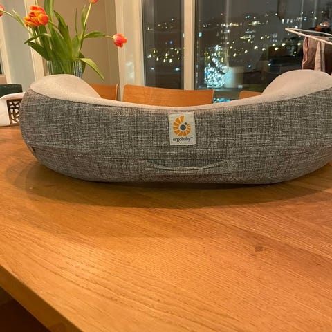 Nesten helt ny ammepute fra Ergobaby selges rimelig. Ny pris er kr. 799. Den er kun brukt et par ganger. Trekket kan enkelt tas av og vaskes i vaskemaskin.