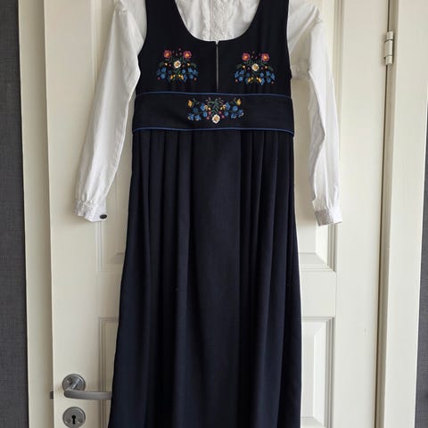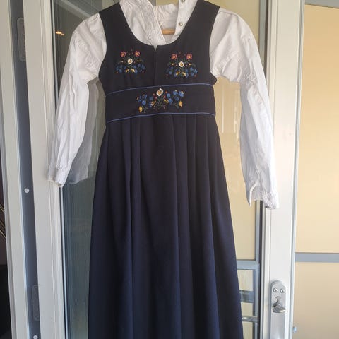 Lite brukt festdrakt til jente str 134/140. Blå farge på drakt med belte i livet. Hvit bunadsskjorte i str 134/140. Selges samlet. Begge fra Cubus.