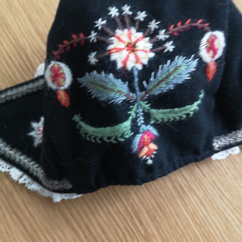 Denne er ubrukt, med pene broderier og ferdig montert.