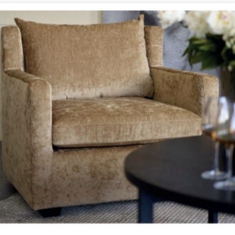 Pent brukt lenestol med puff fra Designers Guild selges for 3000 kroner. Den har stått på hytta noen år, og er i fin stand. Den er kjøpt hos Lev Vakkert på Oppdal. Befinner seg på Averøya. Nypris var over 10.000 kr.