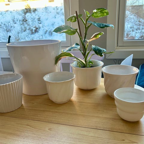 • Keramikkpotter (rosa, hvit, beige, gul)