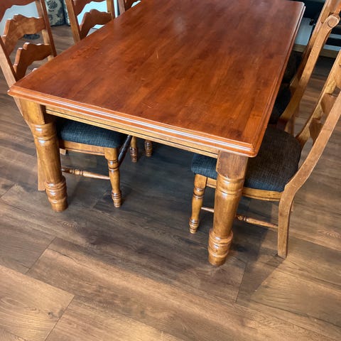 Spisebord i tre , inkludert 6 matchende stoler med stripede trekk. Bordet har i tillegg en ekstra plate som gjør at det blir sitteplass til 10 personer. Mål på bord bredde 100 . Lengde uten tilleggsplate 180 . illeggsplaten er 42. Ingen skader eller flekker på stolene. Bordplaten har noen striper og et lite hakk som vist på bilde. Beina på bodet kan lett skrues på og av. Må hentes