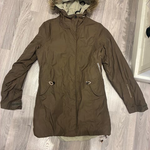 Har 4 ytterlommer+ 2 innerlommer. Strikk i livet + i hette som kan stilles. Trykknapper neders på ermene.