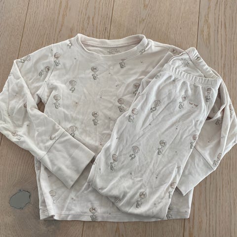 Sett til jente fra C&A. Disse holder seg godt i vask og nupper ikke. Kan se bittelitt antydning til slitasje på det ene kneet. Blomstertrykket er litt svakere på venstre kne. Genser er i str.74 og bukse i str.80. Vi brukte dem samtidig og litt større bukse gjorde at de passet lenger.