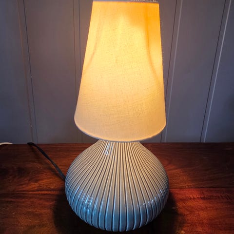 Lamp i keramikk med glaserte frukt. Selve lampa er i perfekt stand. Lampeskjermen har noe små prikker (mulig at de går bort, men tør ikke å prøve), men ellers er den i fin stand. Pen ledning. Lampa er 60 cm med skjerm, og selve lampa er 35 cm. Bør hentes med tanke på skjermen, men hvis du bare ønsker lampa, er det mulig å sende den.