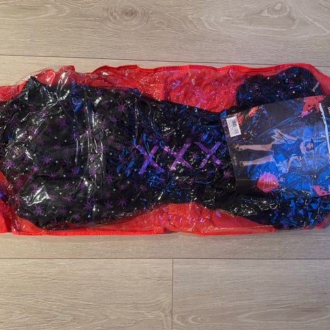 Den perfekte hekse kjolen, i størrelse L med rød og svart farge. Kjolen har lange, vide ermer og snøring foran. Materialet består av en kombinasjon av myk, fløyelsaktig stoff og lett, gjennomsiktig stoff på ermene. Kjolen har glidelås i ryggen og et belte i midjen.