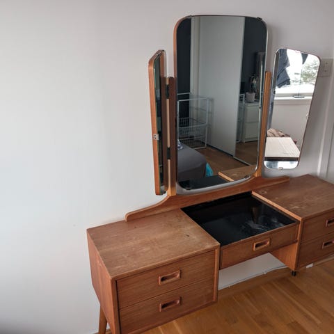 Vintage sminkebord fra 50-tallet - høyde 64cm, men høyde 175cm inkludert speil. Speilet er ikke perfekt, litt «bølget». Avstand mellom underskap 40cm så passer best til noen som ikke er altfor stor hvis man skal bruke det som sminkebord.