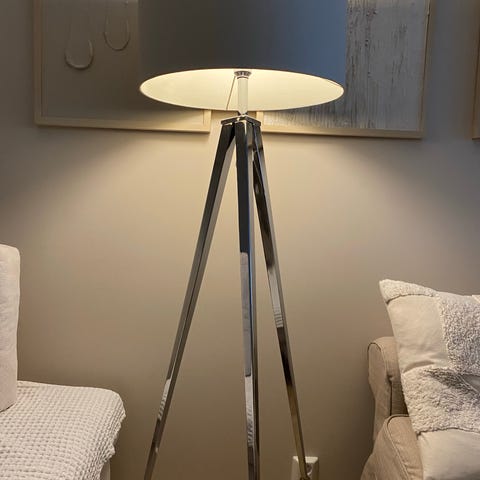 Jeg har brukt den med en mørk blåfarge skjerm, med gull på innsiden. Det ble veldig fint lys. Skjermen er ikke original, men av et annet merke. Mulig å bytte skjerm i en annen farge.