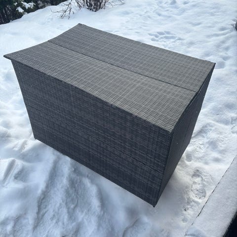 Plass til f.eks. masse puter fra utemøbler, leker, utstyr. Den er som en liten bod til oppbevaring, i tillegg kan man legge noen puter på toppen, så er det benk🎉