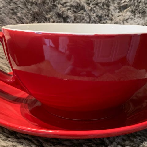 Veldig fint rødprikket jumbokopp i god stand. Pris 75kr. Kan sende.