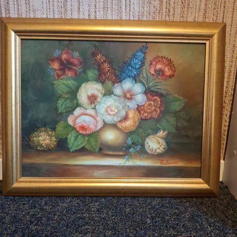 Maleri av en blomstersti med blå og hvite blomster, malt i akryl på lerret. Bildet viser en sti omgitt av frodig grønn vegetasjon og blomster i blåtoner. Passer til dekorasjon i hjem eller kontor.