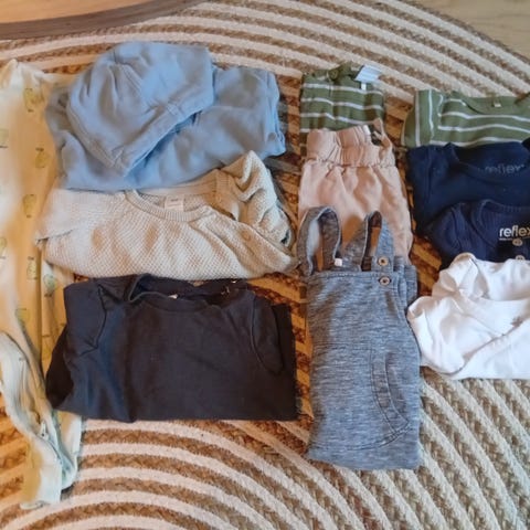 Masse langermede bodyer, Lindex og HM, joggesett fra Zara, genser, joggebukse, to bukser med bukseseler til pent og hverdag, flanellskjorte, joggegensre, strømpebukser, skjortebody