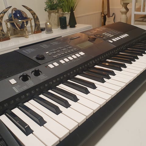 Yamaha PSR-E313 Keyboard med 61 tangenter i svart farge. Inkluderer innebygde høyttalere, LCD-skjerm, flere funksjoner for lyd og rytmevalg, samt tilkoblingsmuligheter for hodetelefoner og eksterne enheter. Egnet for nybegynnere og viderekomne brukere. Det mangler en tangent,men jeg greide å spille på den slik den ble. Går alltids ann å fikses:)