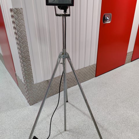 Arbeidslampe med gulvstativ og kabel.
