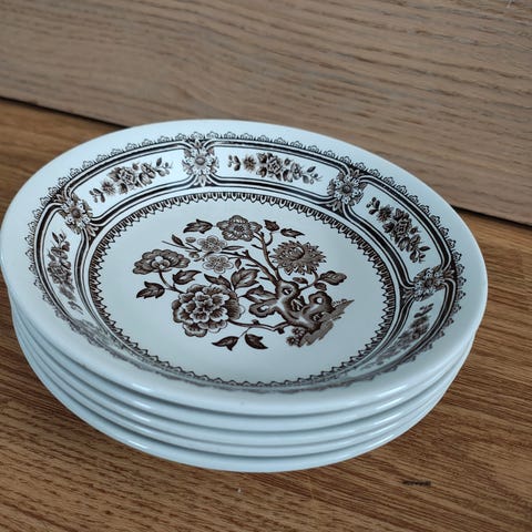 Keramisk dekorativ tallerken i brun farge med hvite detaljer rundt kanten og i sirkler på overflaten. Passer som dekorasjon eller til servering.