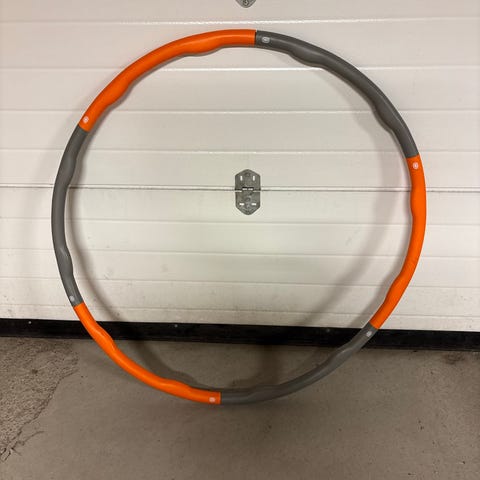 Exerfit Treningshula Hoop med en diameter på 100 cm. Hula hoop er delt i seks seksjoner i fargene rosa og grå, laget for trening og mosjon.