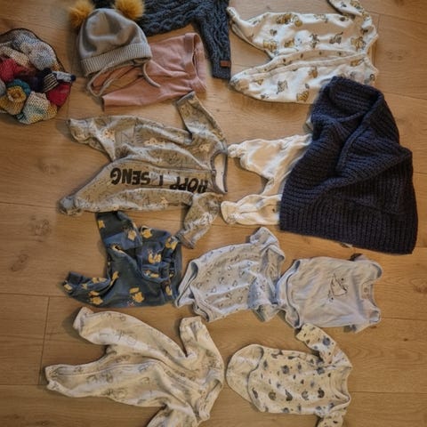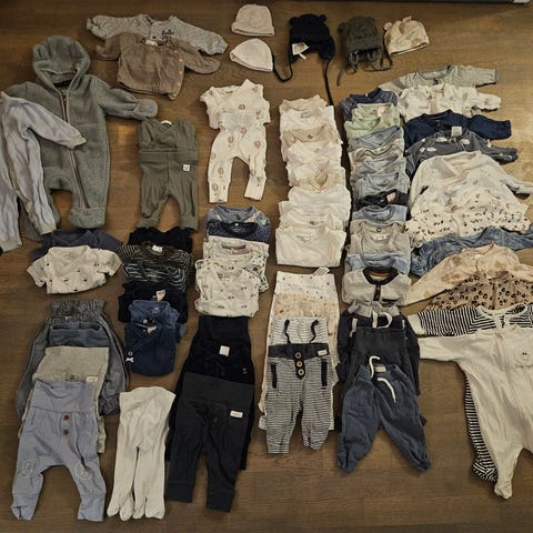 Mye klær som skal være nok fra fødselen til barn er i det minste 1 år gammelt. Mye av disse klærne spesielt i str 50-56 er helt nye eller brukte bare 1-2 ganger. Passer både jenter og gutter.