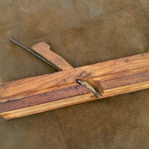 Gammel og velholdt platekutter/vinkelhake fra Berger Langmoen A/S. Flott patina og solid treverk.