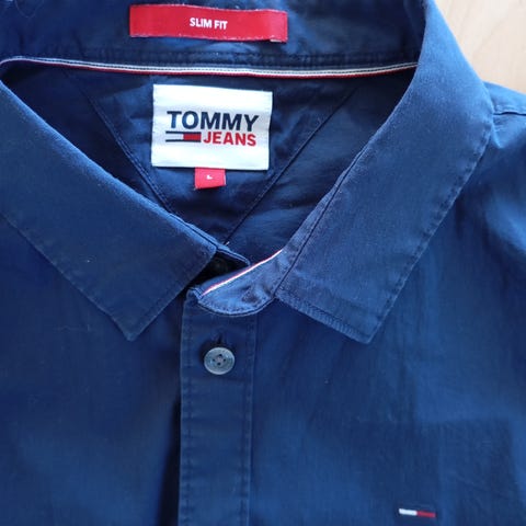 Tommy Hilfiger Slim Fit skjorte i størrelse L. Skjorten er grå/blå og pent brukt.