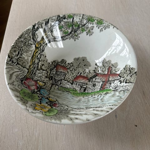 1 asjett, The Mill, Alfred Meakin Staffordshire, diam 17 cm, pris 50kr
