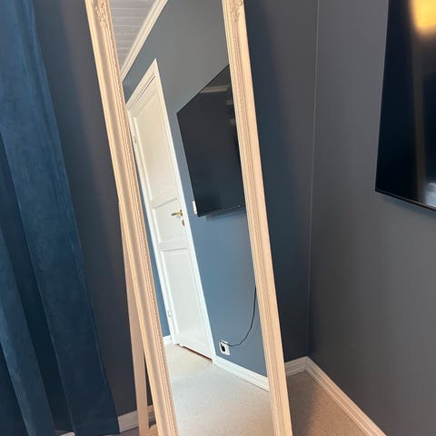 Med tungt hjerte må jeg selge denne speilet💔. Jeg har vært veldig fornøyd med den men har rett og slett plassmangel. Speilen har sølvfarget ramme. Den er et enkelt og tidløst design som passer til ulike rom og innredningsstiler. Jeg har hatt den i inngangen og den var brukt til å skape romfølelse og lys i den lille leiligheten min☺️. Den er lett å bære.